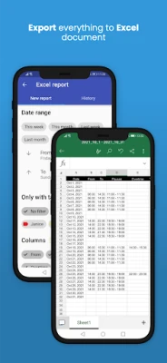 Få en klar överblick över din arbetstid och intäkter med detaljerad statistik och visuella diagram. Utforska rapporter för valfria perioder – månad, vecka eller anpassade datumintervall – och exportera enkelt all data till Excel för vidare analys eller lönehantering. För effektiv organisation kan du skapa återanvändbara mallar för vanliga inställningar, använda taggar för att kategorisera poster, lägga till anteckningar för specifika detaljer och färgkoda för snabb visuell sortering. All din data säkerhetskopieras automatiskt i molnet och kan enkelt delas via populära tjänster som Dropbox, Google Drive eller e-post, vilket garanterar trygghet och åtkomst. En praktisk kalenderwidget ger dig dessutom snabb navigering genom dina registrerade data. Detta verktyg är även optimerat för att underlätta tidshantering för små team, vilket gör det till en komplett lösning för din verksamhet.