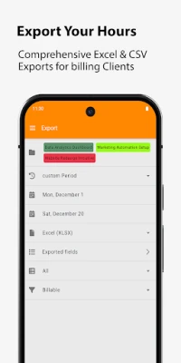 Timesheet erbjuder robusta funktioner för projektadministration, så att du enkelt kan organisera din tid per klient, projekt och specifika uppgifter. Tilldela anpassade timpriser och taggar för att skräddarsy din fakturering, samtidigt som du enkelt kan filtrera, söka och arkivera projekt för att hålla fokus på de mest relevanta uppgifterna. Utöver ren tidsregistrering kan du spåra återbetalningsbara utgifter med kvitton, lägga till detaljerade anteckningar för mötesresultat eller nästa steg, och logga betalda raster separat för att upprätthålla absolut noggrannhet i din tidsrapportering. Skapa snabbt professionella rapporter i XLSX- eller CSV-format för fakturering eller lönehantering, med flexibla datumintervall och smidiga delningsalternativ via e-post eller molntjänster.