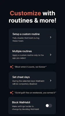 Denna unika metod är rotad i psykologisk forskning, där en liten fysisk barriär fungerar som en "åtagandeanordning" som hjälper dig att hålla fast vid dina mål och motstå frestelser. WallHabit förvandlar skrollande från en reflex till ett medvetet val, vilket direkt bidrar till ökad produktivitet, djupare fokus vid studier eller arbete, och en förbättrad sömnkvalitet. Säg adjö till oändliga Reels och Shorts – WallHabit erbjuder en fungerande lösning för att filtrera bort just de delarna som fångar dig, utan att du behöver blockera hela appen. Det är den smarta vägen till ett mer balanserat digitalt liv, skräddarsydd för att passa just dina behov.