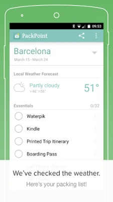 Med din optimerade packlista på plats, sparar PackPoint den för framtida bruk och ger dig möjligheten att dela den med vänner och familj som också kan dra nytta av smarta packningsrutiner. För den verkligt effektiva resenären finns det möjligheter att djupdyka i PackPoints Premiumfunktioner via anpassningsmenyn. Dessutom kan du integrera PackPoint med TripIt för att automatiskt generera packlistor direkt från dina reseplaner. Packa smart med PackPoint och undvik onödiga bagageavgifter, samtidigt som du njuter av en bekymmersfri start på din resa.