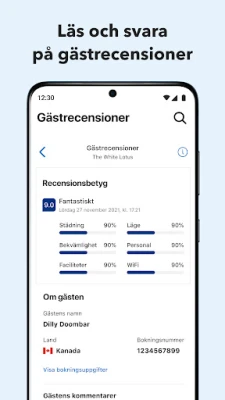 Appen ger dig också en heltäckande översikt över din fastighets prestanda och detaljerade bokningsinformation. Utforska specifika resultat för dagen, bläddra igenom din kalender för både historiska och kommande bokningar, och granska varje bokningsdetalj – inklusive antal gäster, specifika rumstyper och vistelsens längd. Du får en tydlig bild av totalsummor, prisöversikt per natt och aktuella avbokningsvillkor, vilket ger dig full kontroll och klarhet över din verksamhet på Booking.com.