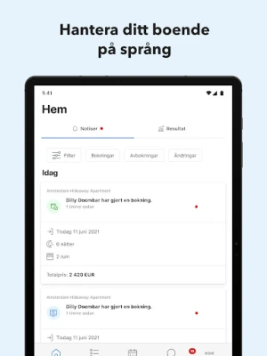Håll dig ständigt uppdaterad om varje aspekt av din verksamhet. Få omedelbar insyn i dagens händelser – från nyanlända gäster och avresor till inkommande bokningar, ändringar och annulleringar. Missa aldrig en viktig recension. Dessutom blir det enklare än någonsin att kommunicera med dina gäster; direktmeddelanden via live-chatt och smarta, föröversatta svarsmallar garanterar snabba och professionella svar på de vanligaste frågorna, vilket stärker gästrelationerna.