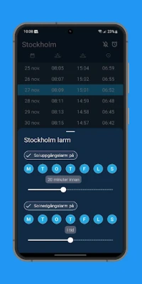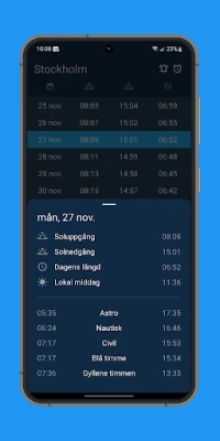 För den som söker det lilla extra erbjuder appen detaljerad information om solens gyllene och blå timmar – perfekt för fotografer eller den som vill maximera sin upplevelse av ljusets skiftningar. Med en bekväm widget direkt på hemskärmen har du alltid solens schema nära till hands. Utöver detta kan du utforska tider för civil, nautisk och astronomisk skymning, lokalisera dig snabbt med GPS, spara dina favoritplatser för enkel åtkomst och njuta av en helt annonsfri upplevelse. Med en smidig snooze-funktion för larmen får du dessutom full kontroll över din morgonritual.