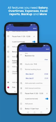 Med smarta funktioner blir det enkelt att logga dina pass. Stämpla in och ut med ett tryck, och låt systemet automatiskt hantera övertid, oavsett om det är dagligen eller veckovis. Konfigurera enkelt betalda och obetalda pauser, samt definiera olika typer av arbetspass för maximal flexibilitet. Lägg till engångsbonusar, timbaserade tillägg eller specificera kostnader direkt i appen. Dina löneberäkningar utförs automatiskt, vilket säkerställer exakthet och sparar dig värdefull tid.