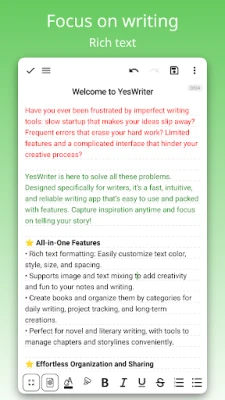 Släpp loss din fulla kreativa potential och organisera ditt liv med YesWriter, en sofistikerad plattform designad för tänkare, berättare och alla som älskar att fånga sina idéer. Med YesWriter kan du enkelt förvandla dina tankar till levande innehåll med omfattande textformatering – justera färg, stil, storlek och avstånd för att perfekt uttrycka din röst. Integrera text med bilder för att skapa dynamiska och engagerande anteckningar eller berättelser, vare sig det handlar om dagliga reflektioner, komplexa romanprojekt eller akademiska uppsatser. YesWriter tillhandahåller de verktyg du behöver för att skapa böcker, hantera kapitel och strukturera komplexa berättelser med intuitiva funktioner som stödjer ditt kreativa flöde.